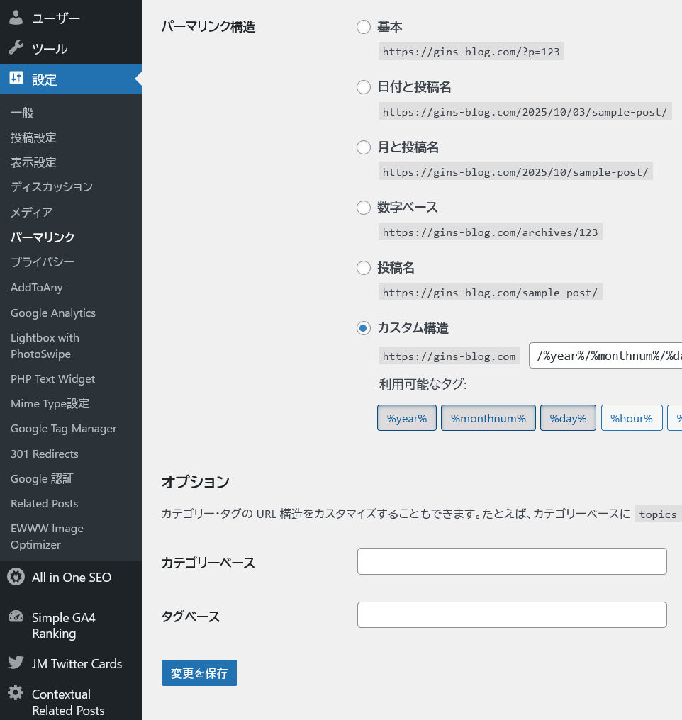 WordPress のダッシュボードから「設定 > パーマリンク」のページ。以下のページね